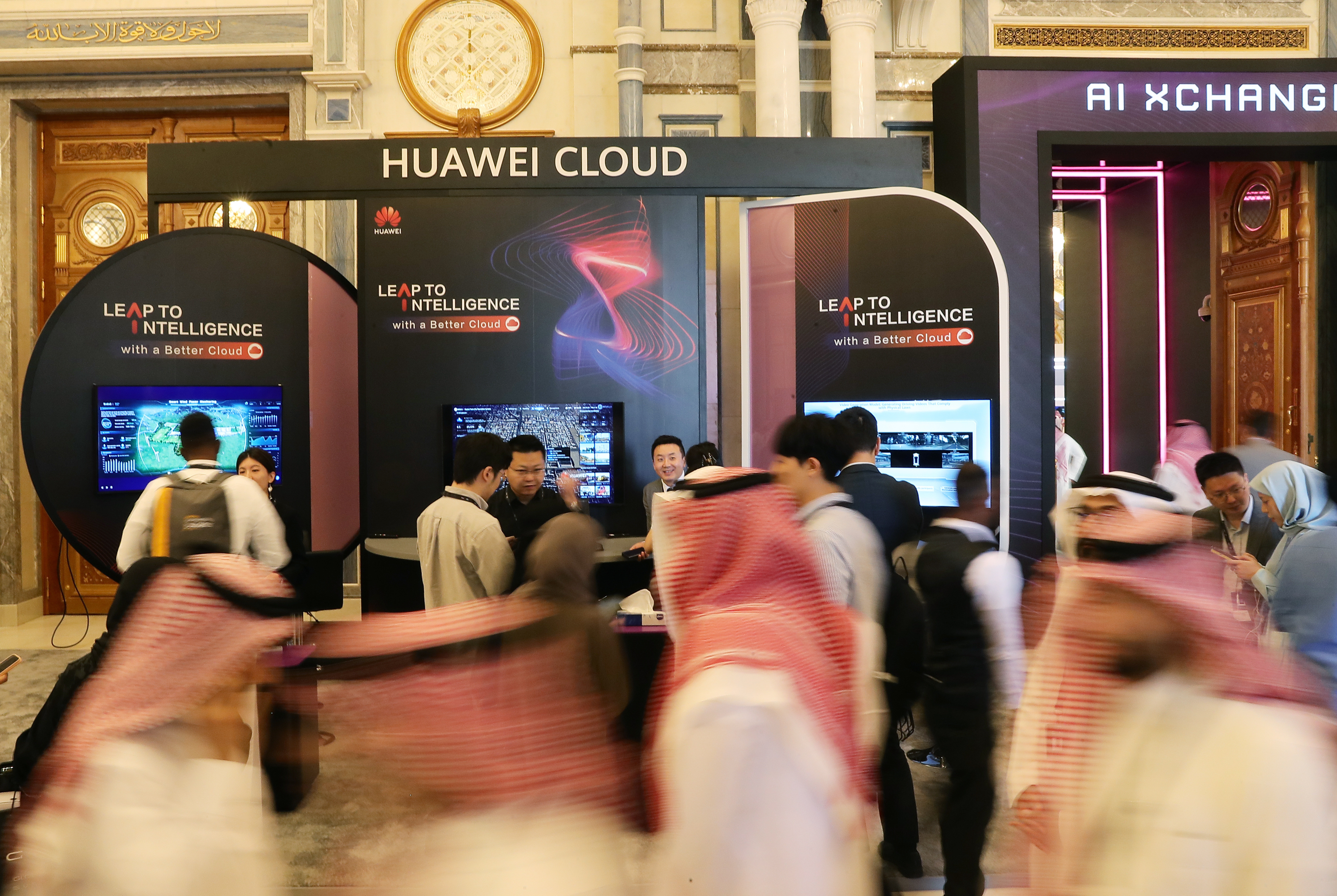 9月10日,东说念主们在沙特阿拉伯王人门利雅得举行的第三届宇宙东说念主工智能峰会现场的华为云展台参不雅。新华社记者 王东震 摄