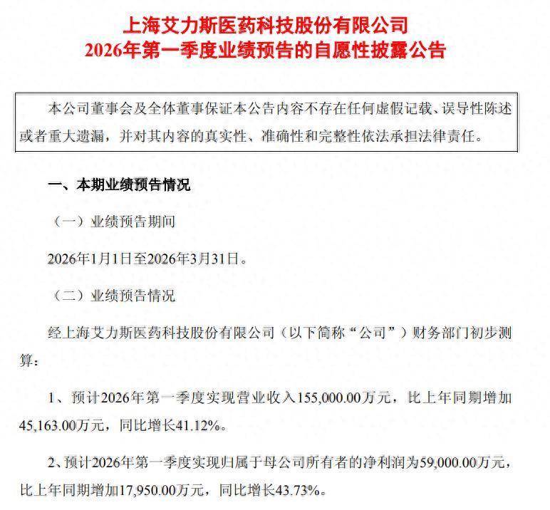 3月3日盘后云开体育,艾力斯(688578.SH)败露2026年第一季度事迹预报,这亦然A股医药生物行业上市公司中的首份一季度事迹预报。