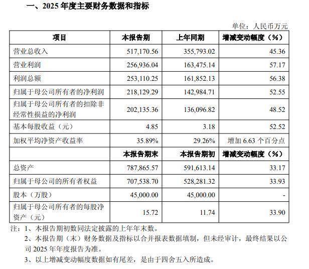 2026年2月26日,艾力斯曾发布2025年龄迹快报。敷陈期内,公司完了营业总收入 517,170.56 万元,同比增长45.36%;完了包摄于母公司通盘者的净利润 218,129.29 万元,同比增长52.55%;包摄于母公司通盘者的扣除非经常性损益的净利润 202,135.36 万元,同比增长48.52%。