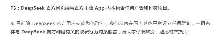 现在除 DeepSeek 官方用户一样微信群外,从未在国内其他平台栽植任何群组,一切宣称与 DeepSeek 官方群组相关的收费行为均系假冒。