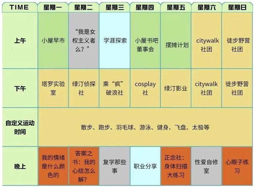 这是咱们一周的大致安排。行动会辘集环球的酷好酷好和需求来缠绵,这其实更主要塞是给环球提供一个生活的节奏,创造酬酢和潜入了解相互的契机。
