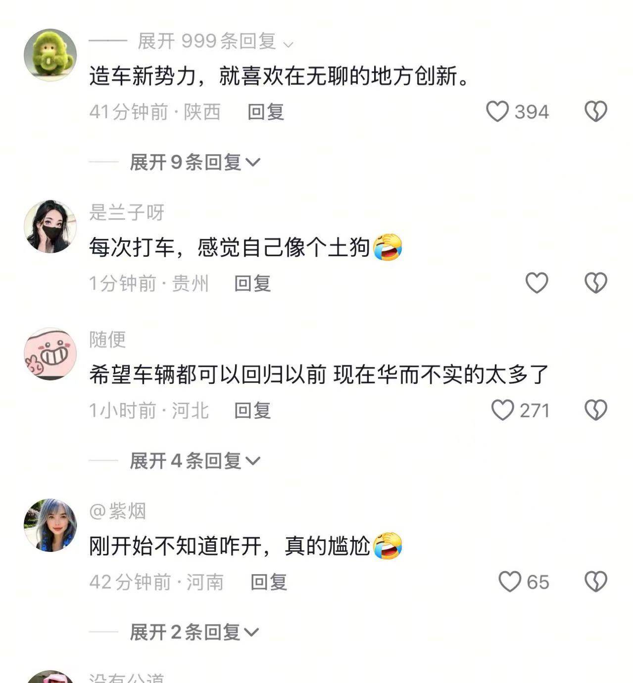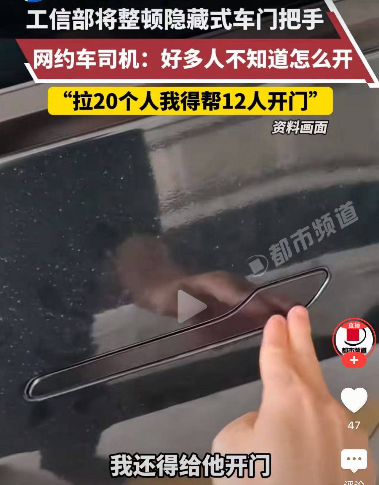 这一不雅点在网友的驳倒中取得了平方共识。很多网友纷繁暗示,他们在使用荫藏式门把手的车型时感到困惑和未便:“每次打车齐嗅觉我方像个土狗,不知谈门把手在那儿”;“每次齐要问司机门把手在哪,很纳闷”;“有的车下车时根蒂找不到开门的地点”;“当大无数东谈主齐不会用的时分,这野心就显得有些反东谈主类了”。